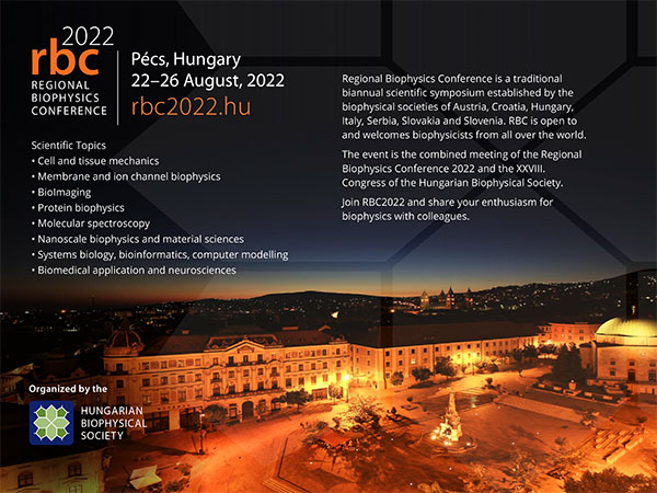 It is with pleasure that we invite you to participate in the Regional Biophysics Conference (RBC) to be held August 22-26, 2022, Pécs, Hungary.